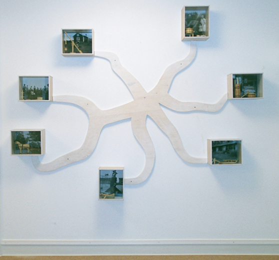 Koivu, akryyli, vitriinit, Ruskahovin palvelukeskuksen asukkaiden valokuvat lapsuuden kodeista ja tarve-esineiden pienoismallit.
